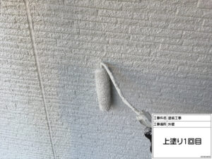 本日は外壁塗装工事の工程で、**上塗り1回目(中塗り)**を施工しました。